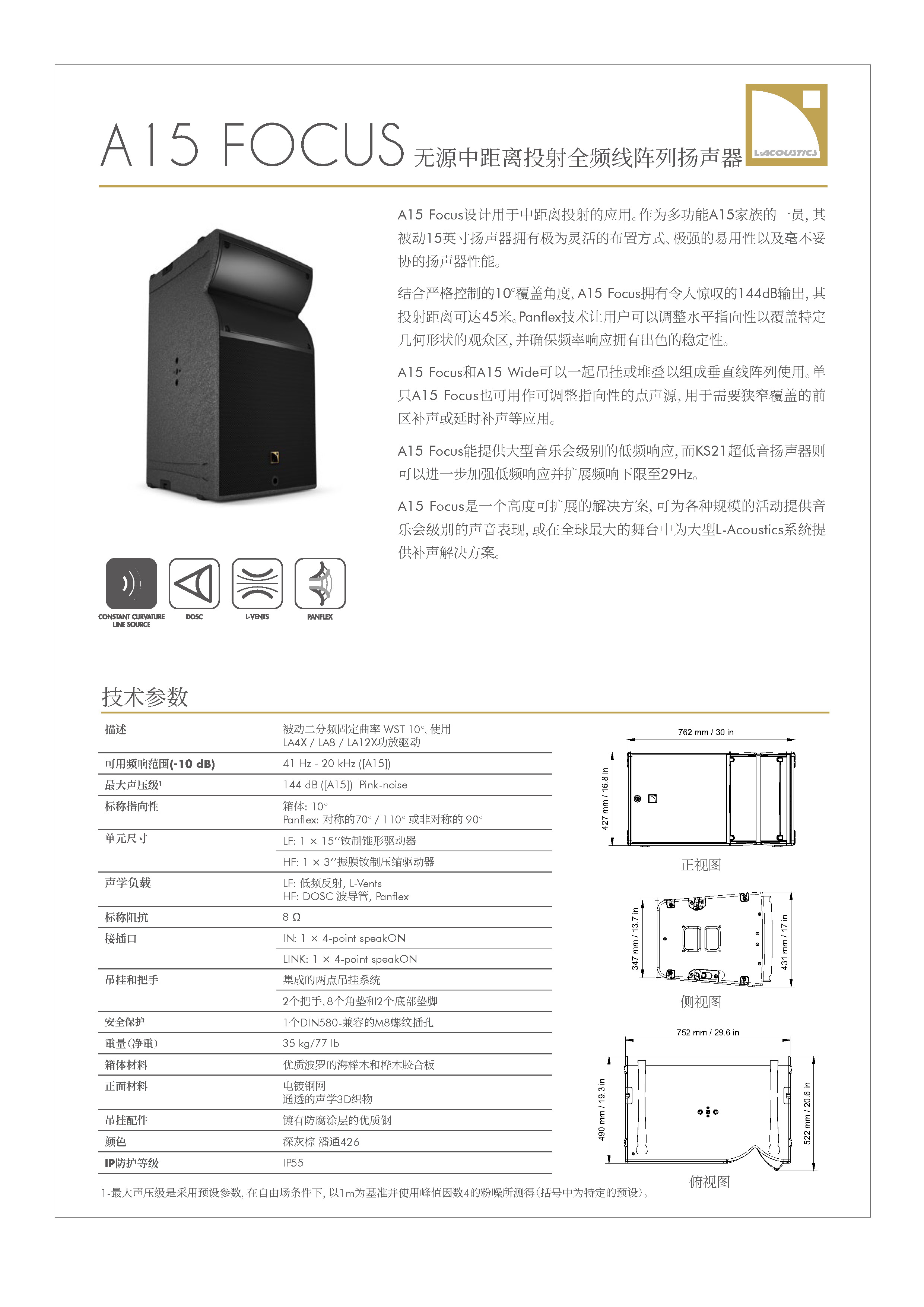 A15拥有两种不同覆盖的箱体(10°或30°),箱体上带有用户可调整的波导 指向性Panflex (70°、110°或不对称的90°)以及一系列用于垂直或水平安装 的配件