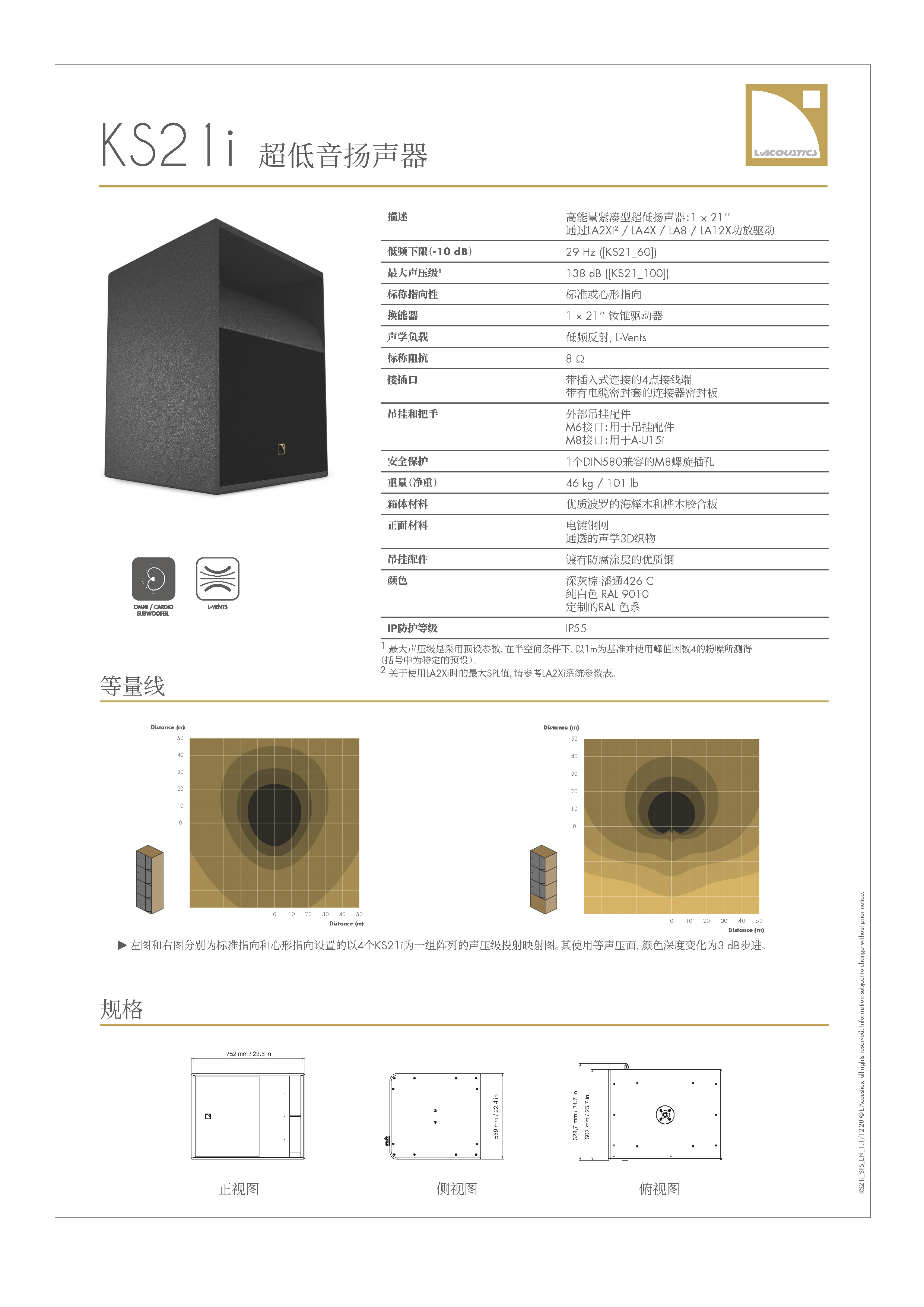 KS21i是紧凑型参考级超低音扬声器KS21的固定安装版本,为扩展A15i 和A10i系统的频响带宽而设计。KS21i与其流动演出版本具有相同的声 音表现,但其简化了安装配件以达到更好的视觉体验。