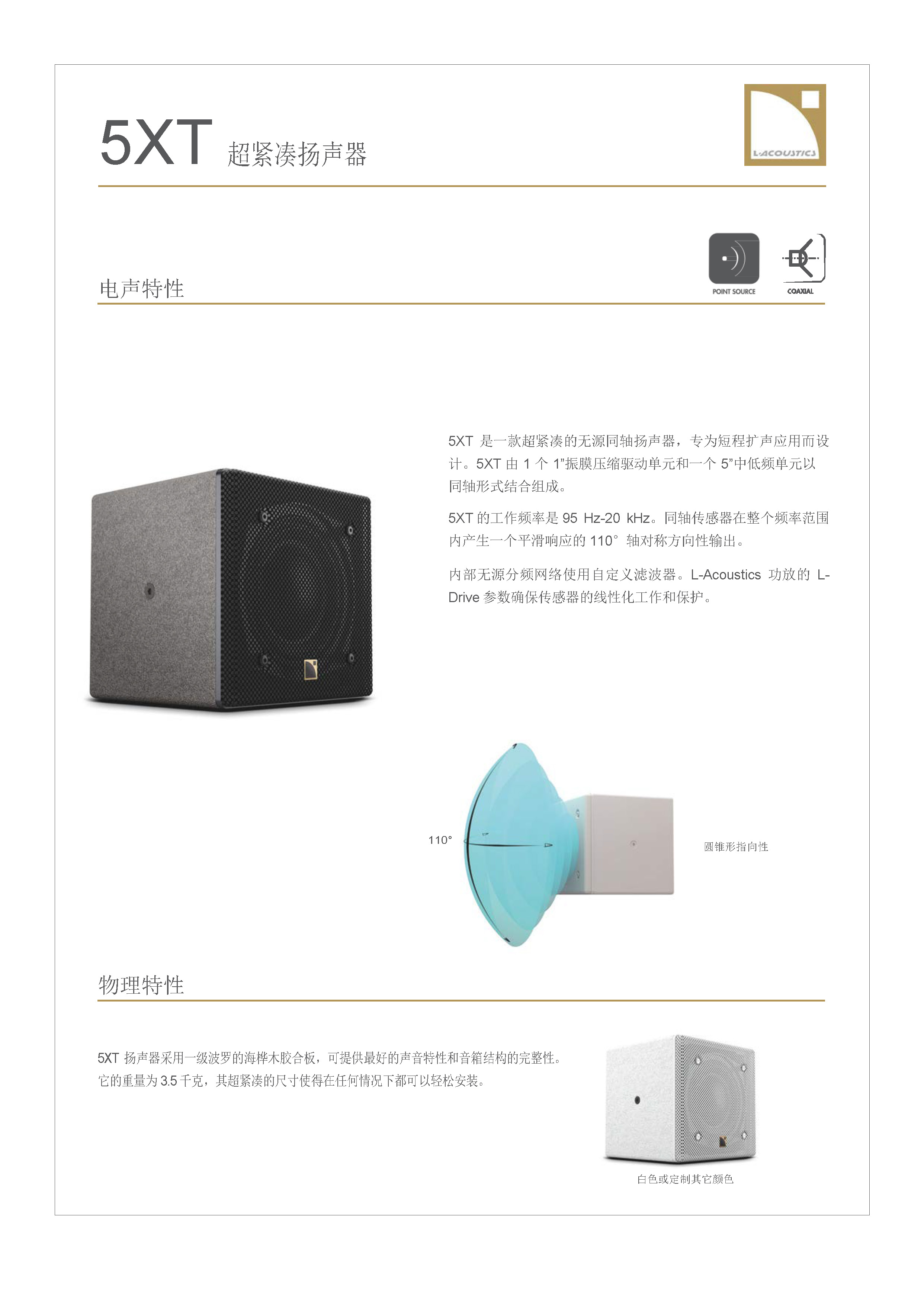 5XT 是 L-ACOUSTICS® XT 同轴系列中超紧凑的音箱。 5XT 扬声器是被动两分频设计,标称阻抗为 16Ω,由 1”振膜压缩驱 动器和 5”中低频单元(低音反射调谐)组成。